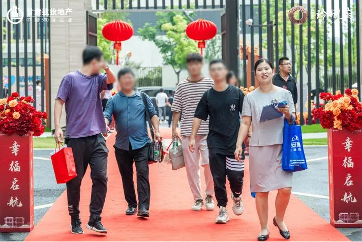 經(jīng)過盛裝布置,園區(qū)沿途一路鋪裝紅毯,枝頭掛滿紅燈籠,單元門口點(diǎn)綴燦爛花束,隨處可見“歡迎回家”的標(biāo)語,“回家”的暖流直抵人心。